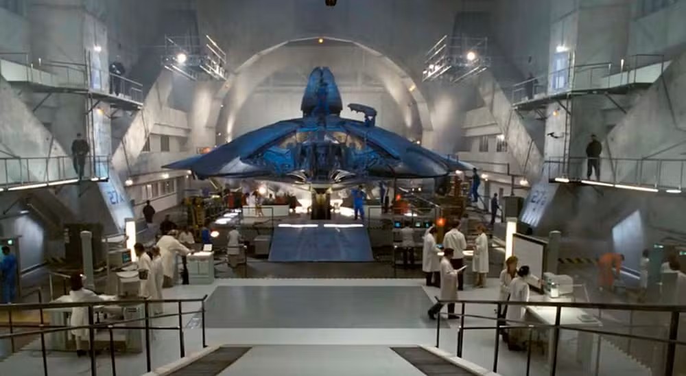 Uma nave alienígena nas instalações da Área 51 em Independence Day (1996) — Foto: Reprodução