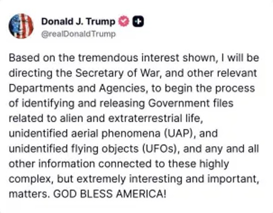 Em 19 de fevereiro de 2026, o Presidente Donald Trump ordenou ao Pentágono e a outras agências federais que começassem a identificar e a divulgar arquivos governamentais relacionados com UFOs, agora formalmente designados por Fenômenos Anômalos Não Identificados (UAPs); incluindo materiais relacionados com “vida alienígena e extraterrestre”.