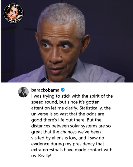 A conversa também abordou a participação do ex-presidente Barack Obama no podcast No Lie with Brian Tyler Cohen , em 14 de fevereiro de 2026, durante a qual Obama afirmou, em um segmento de falas rápidas, que alienígenas são reais.